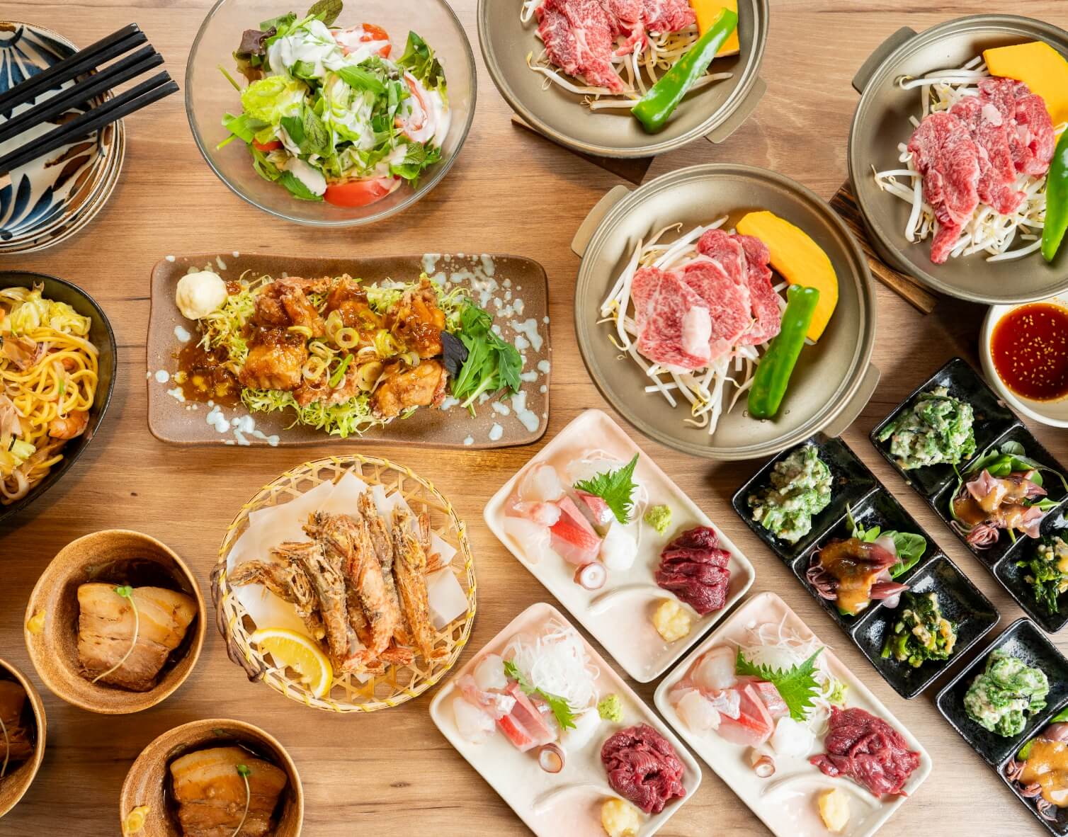 名物の⽶の娘豚の⾓煮や刺⾝の盛り合わせなど、地元の⾷材をふんだんに盛り込んだメニューで、楽しい和やかなひと時をお過ごしください。