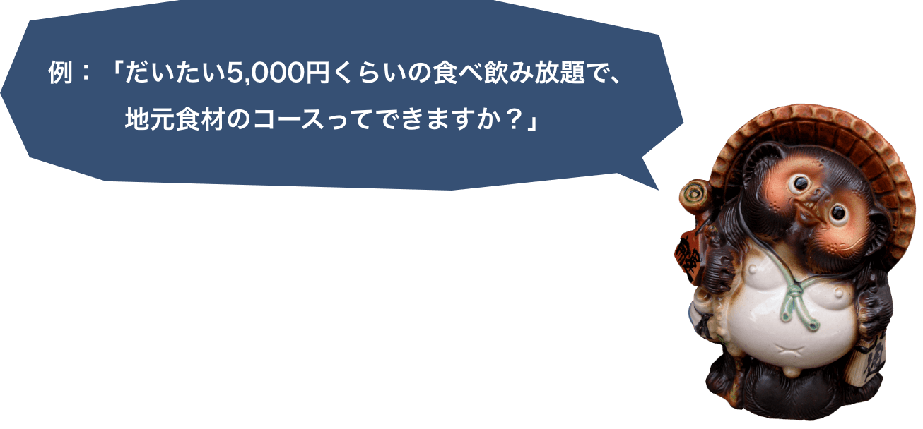 コースの料金やメニューについて、詳しくは注文時にご相談ください。ご予算やご希望にあわせてご用意いたします!
