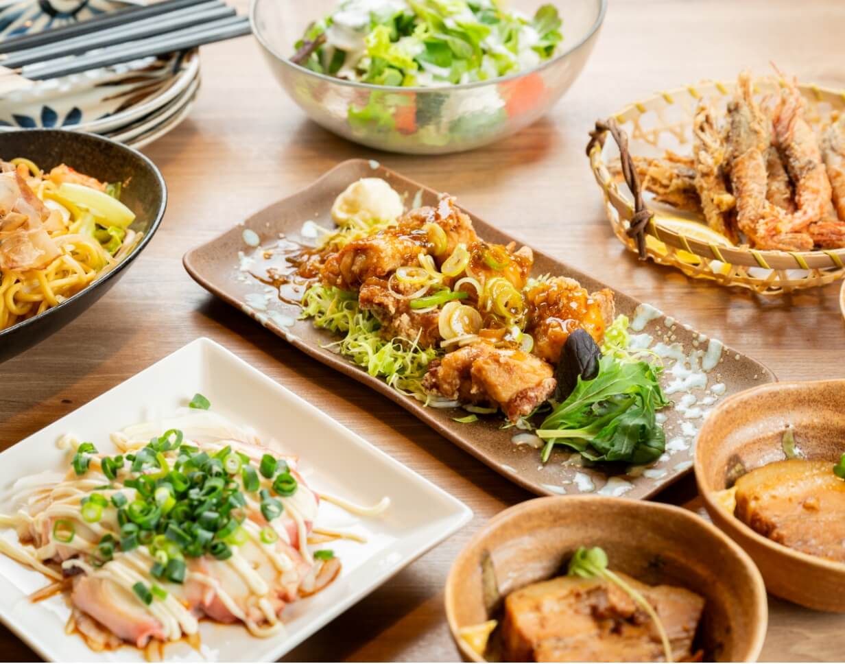 名物の⽶の娘豚の⾓煮や刺⾝の盛り合わせなど、地元の⾷材をふんだんに盛り込んだメニューで、楽しい和やかなひと時をお過ごしください。
